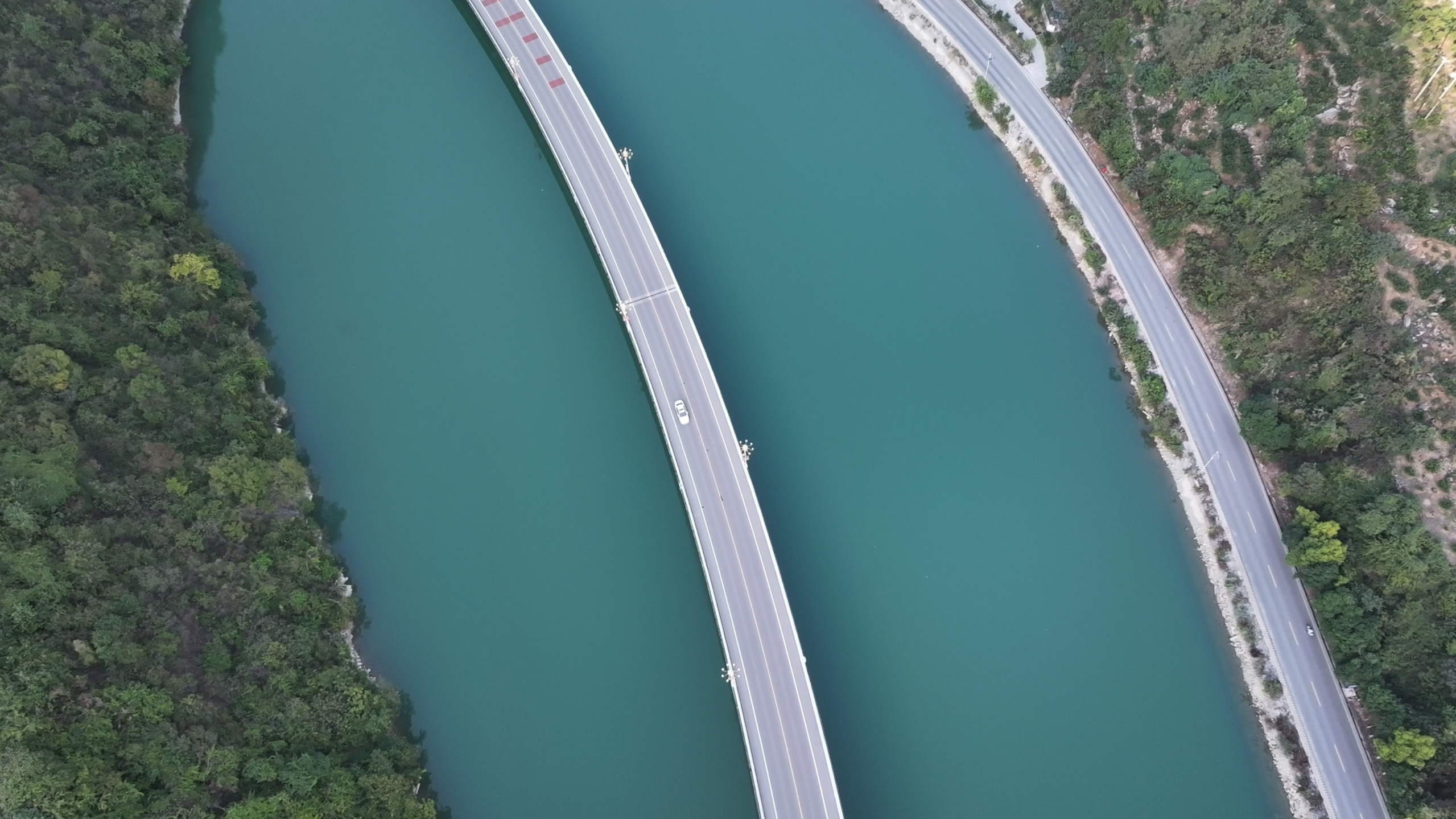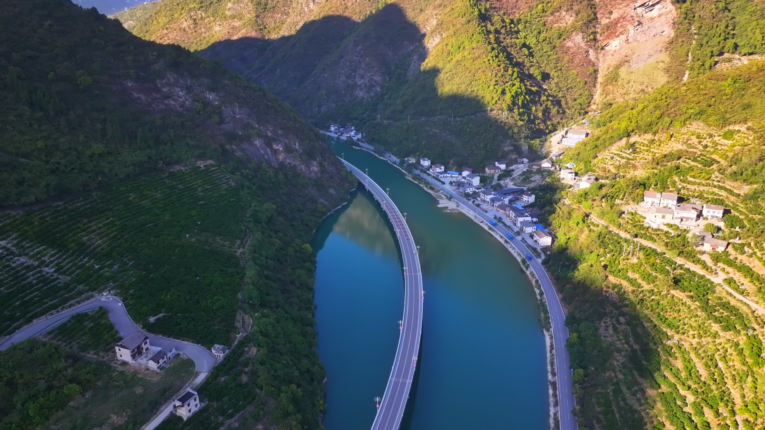 The Guzhao Highway is regarded as one of China's most scenic overwater routes. As the Three Gorges Reservoir fills to about 167 meters for winter, the water beneath the road rises, showcasing a stunning display of autumn beauty.