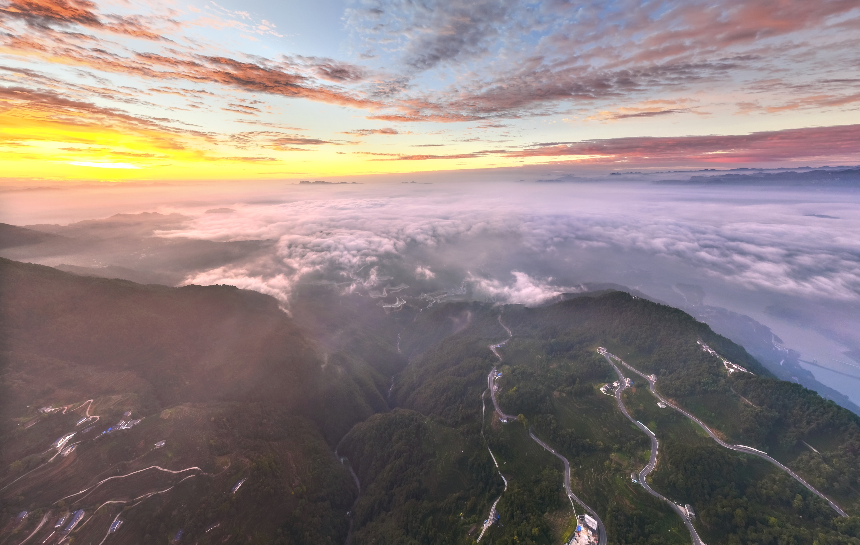 Above Yichang’s Gucunping Village, the morning brings with it vibrant hues of orange, crimson, and gold, creating a breathtaking natural spectacle.