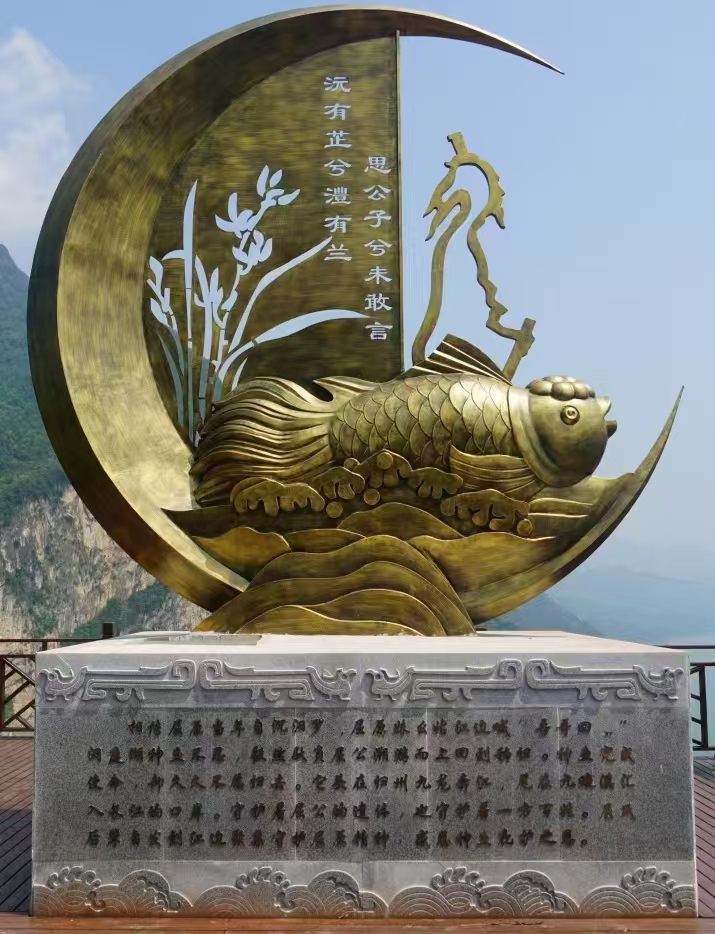 The statue on the Divine Fish Terrace features the divine fish carrying Qu Yuan, alongside an excerpt from “Nine Songs” in his “Chu Ci.”