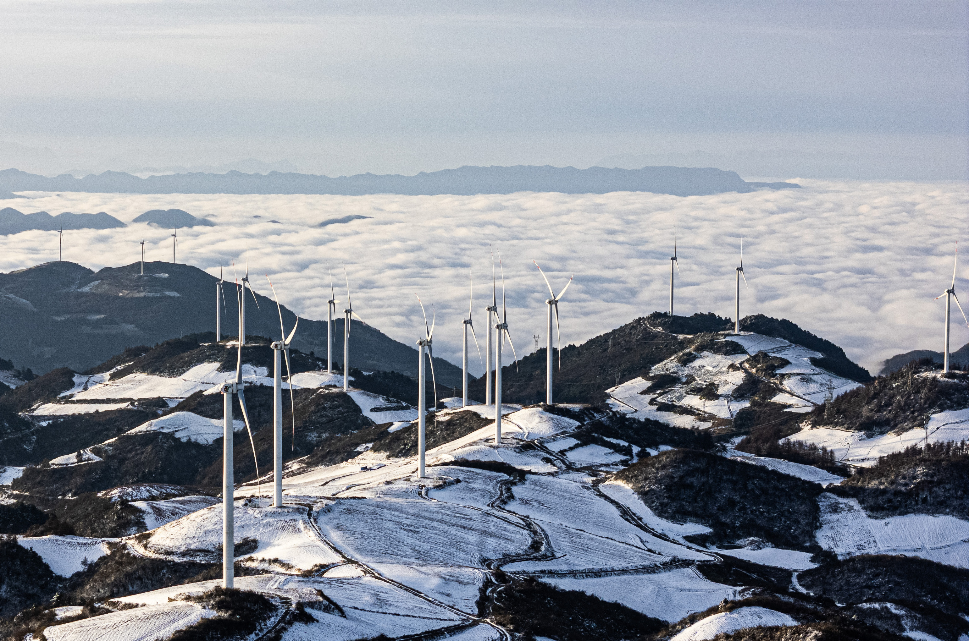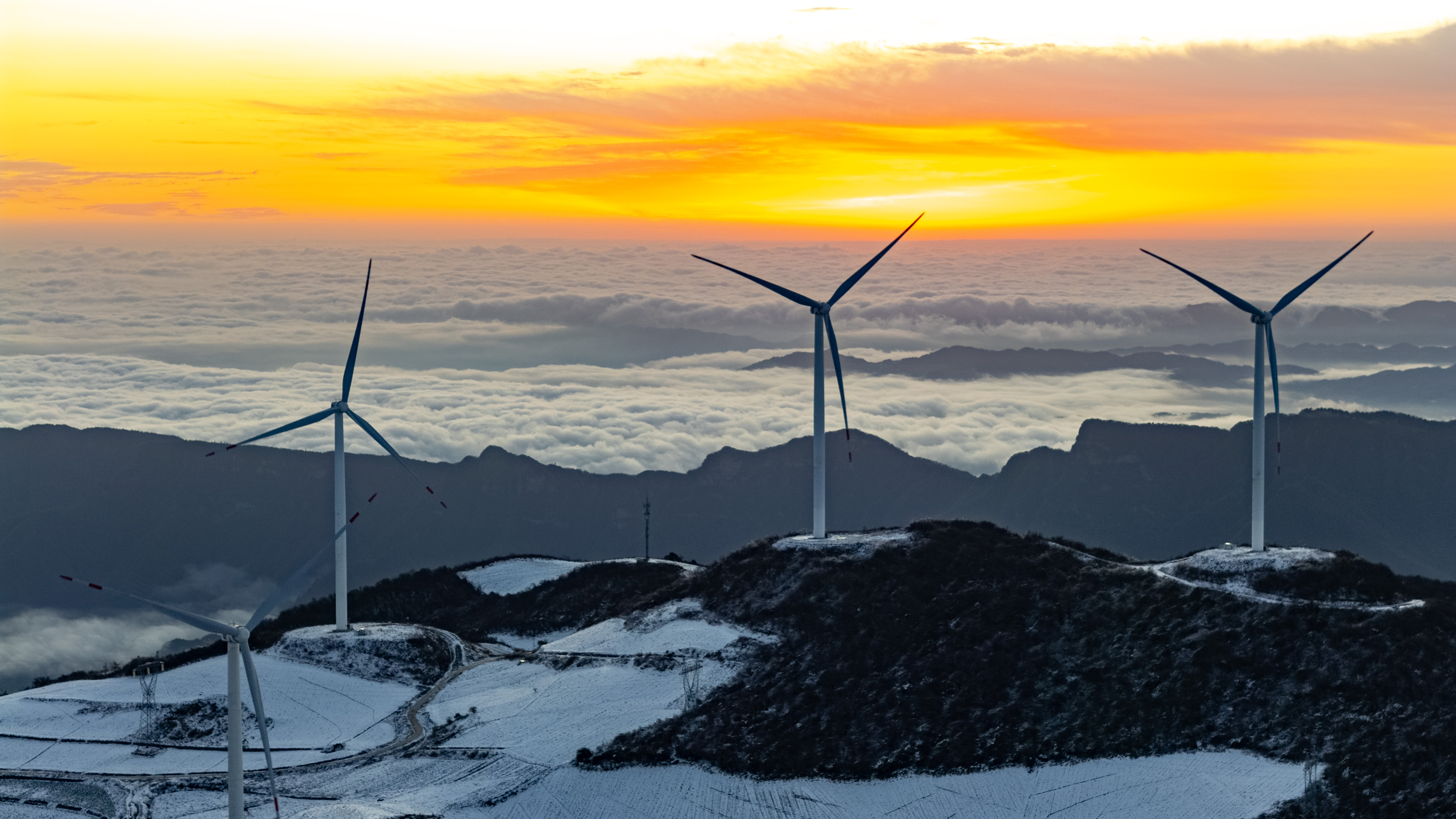On November 26, high-altitude wind turbines in Zigui County created a picturesque scene amid the snow. In recent years, Zigui has been promoting renewable energy and rural development through the use of high-altitude turbines.