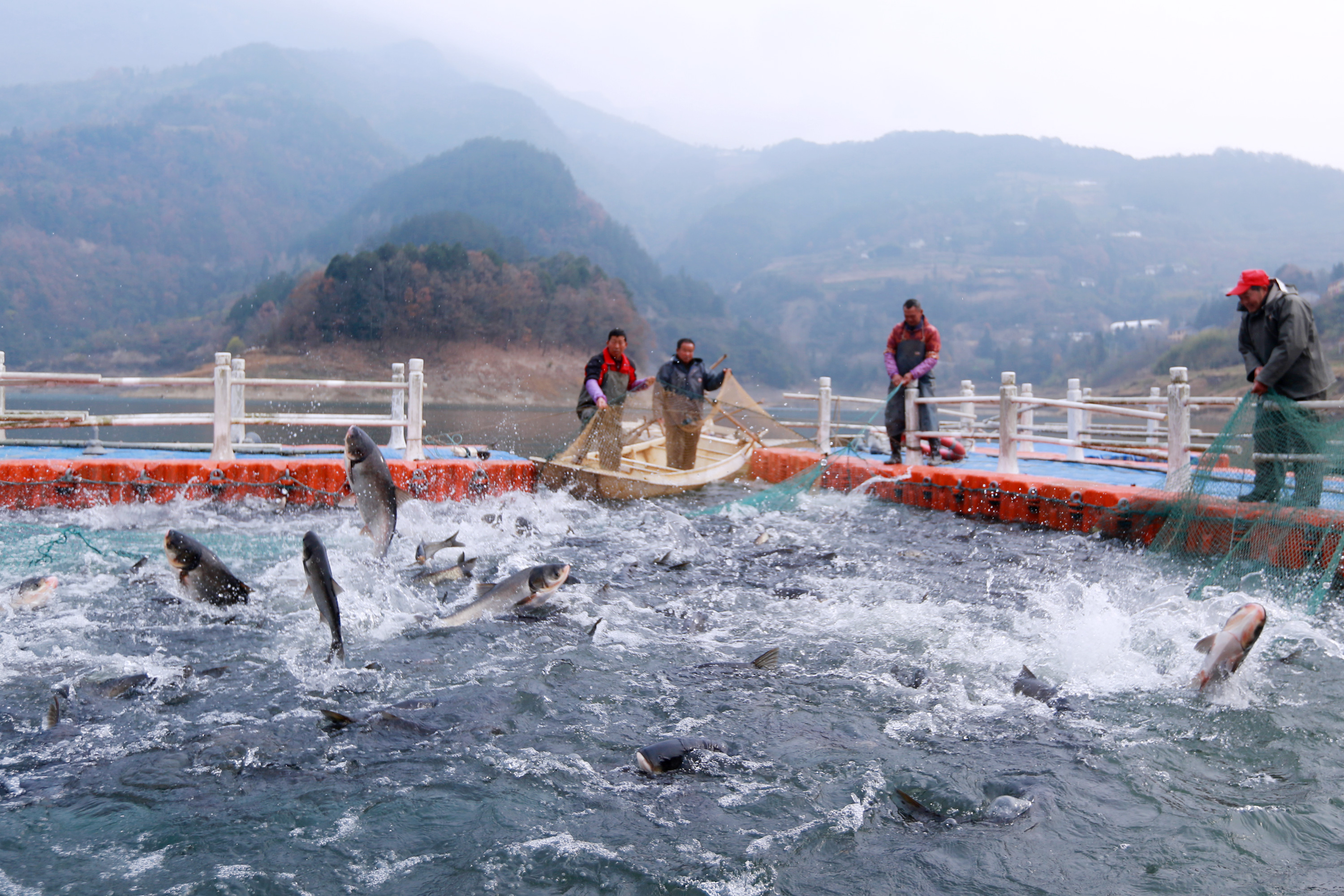 Fish jump out of the water as fishermen tighten the net. Photo by Wang Gang.