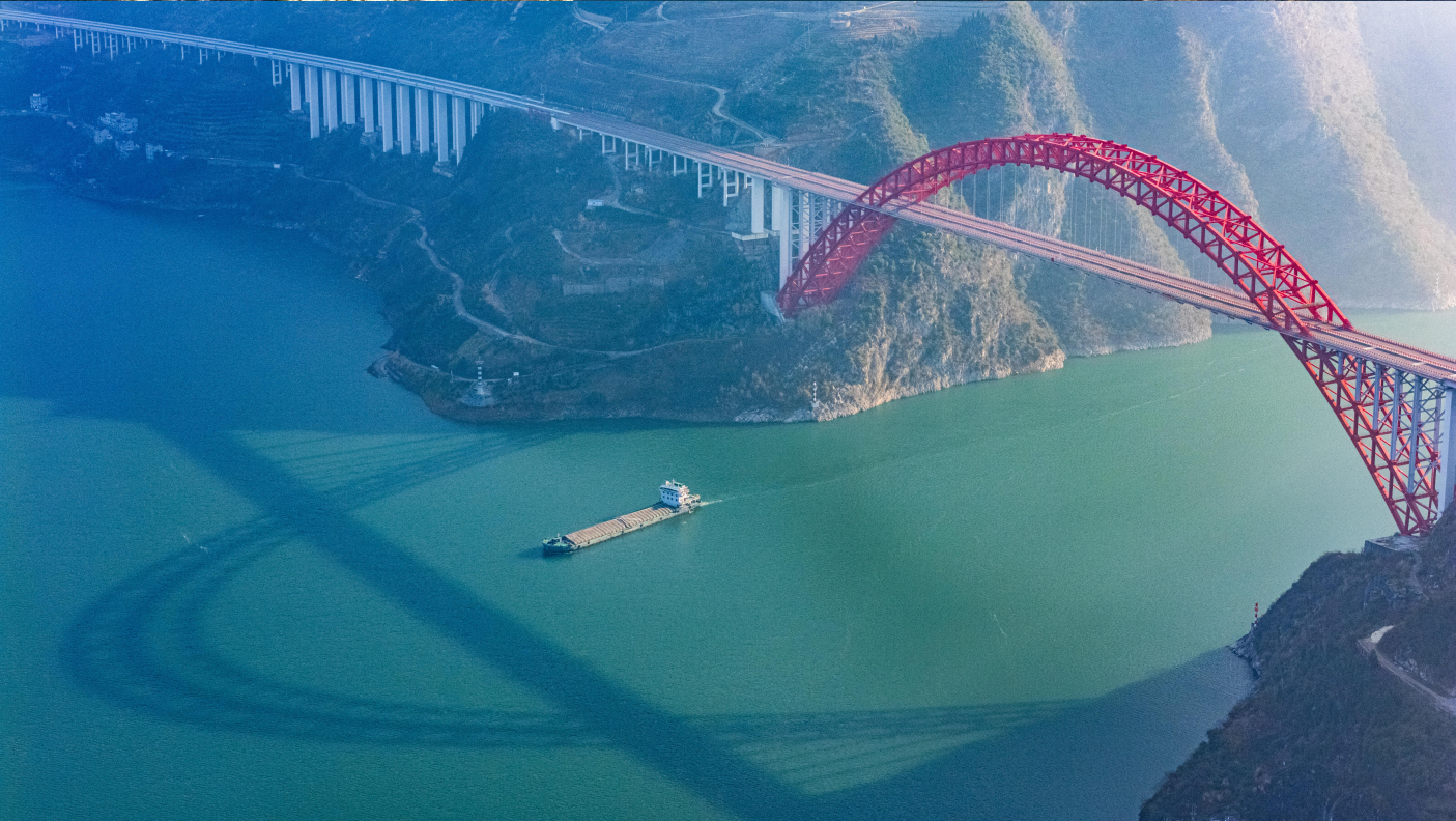 At sunrise, the morning light covers the Zigui section of the Yangtze River. An otherworldly scene is created as ships sail under the sun and clouds.