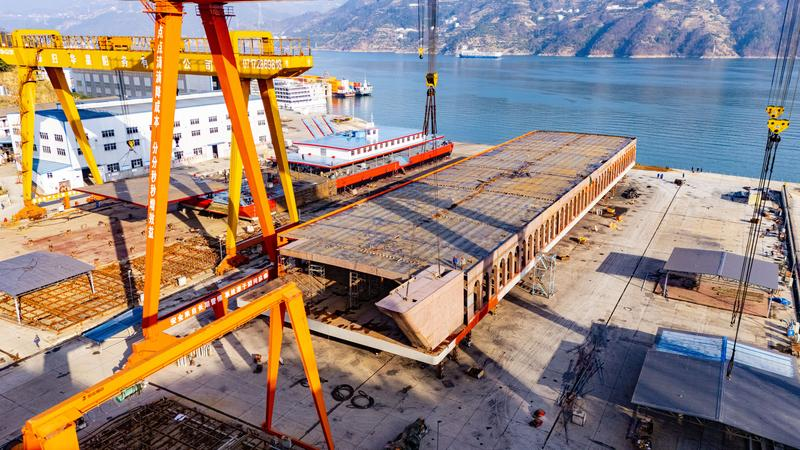 Workers are constructing a new energy roll-on/roll-off ship at the Zigui Green Intelligent Ship Industrial Park. Scheduled for completion by June 2025, this vessel is one of three new energy ro-ro ships designated for service along the Yangtze River. It will be powered by methanol fuel generator sets and a lithium battery system, achieving a maximum speed of 22 kilometers per hour and a minimum continuous sailing time of 100 hours.