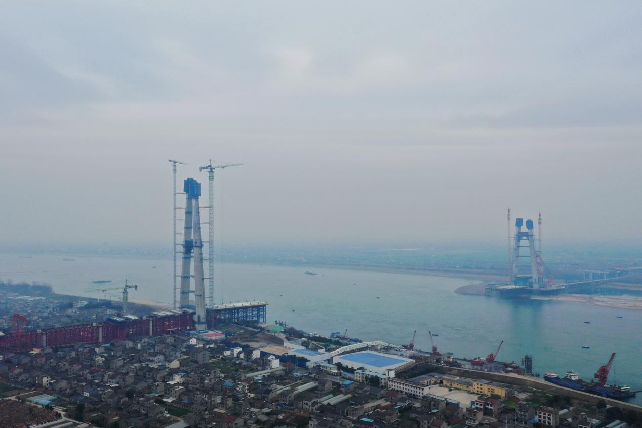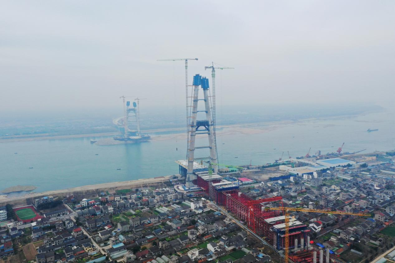 Construction of the Zhijiang Yangtze River Bridge is progressing rapidly. The bridge spans 1,549 meters, featuring a main span of 890 meters and six lanes. The north main tower is set to be capped next month, with completion expected in December.