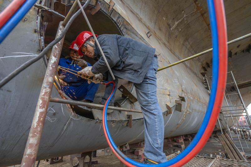 Workers busy constructing a ship at Yichang Xinhui shipyard. Photo by Fu Beibei.