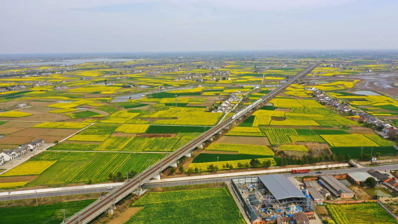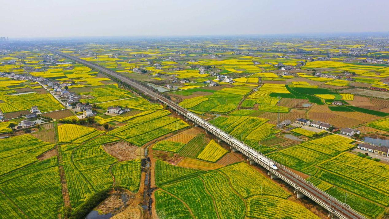 Golden rapeseed flowers and green barley fields create a striking contrast in Zhijiang, forming a vibrant scene from the air. A high-speed train traverses this colorful landscape, enhancing its beauty.