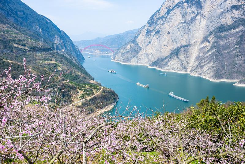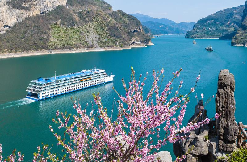 As the Yangtze River winds through Zigui County, warmer temperatures and sunshine bring the landscape to life. Ships sail slowly across the water, while lush mountains and blooming flowers on both banks showcase the beauty of spring.