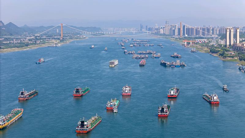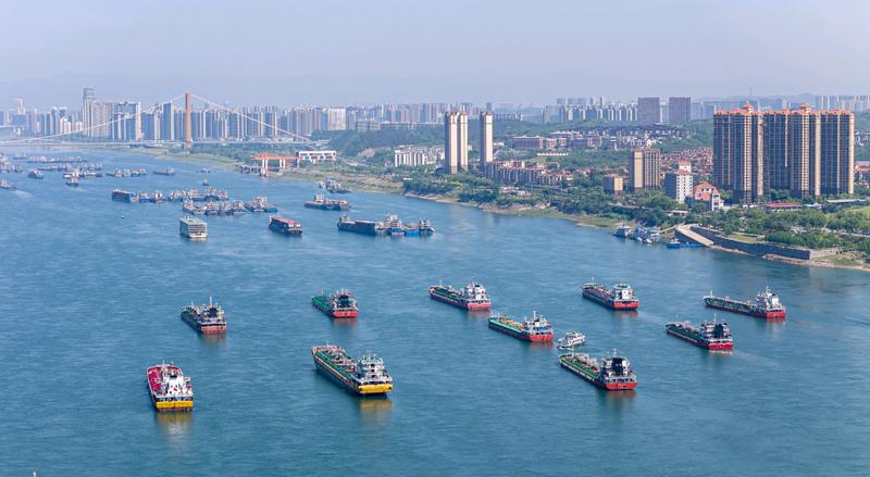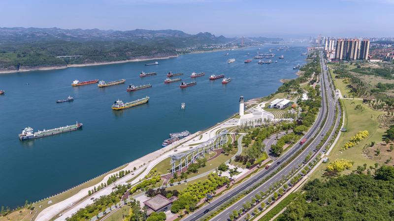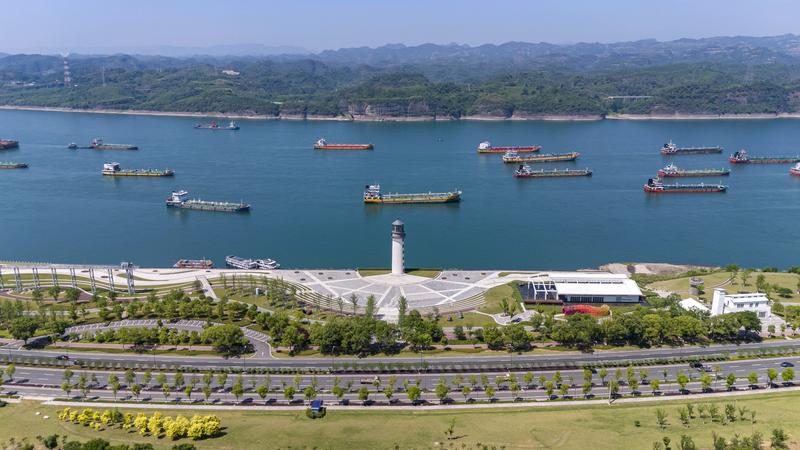 Cargo ships navigated the Yichang section of the Yangtze River on May 12, illustrating a bustling transportation scene. The Yangtze, dubbed the "Golden Waterway," ranks among the world's busiest navigable inland channels.
