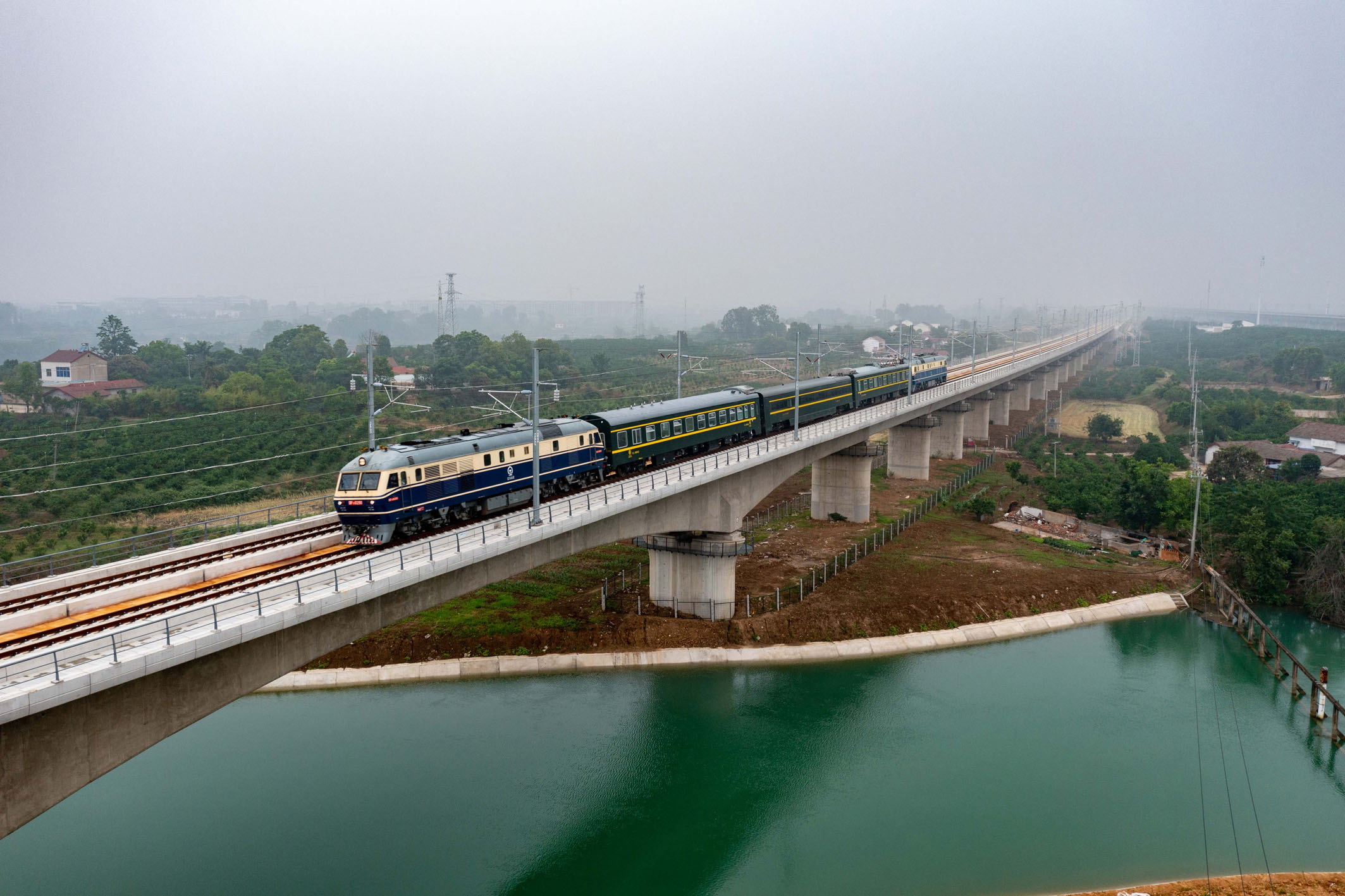 On May 15, a test train conducted comprehensive evaluations on the Wuhan-Yichang section of the Shanghai-Chongqing-Chengdu High-Speed Railway. (Drone photo)