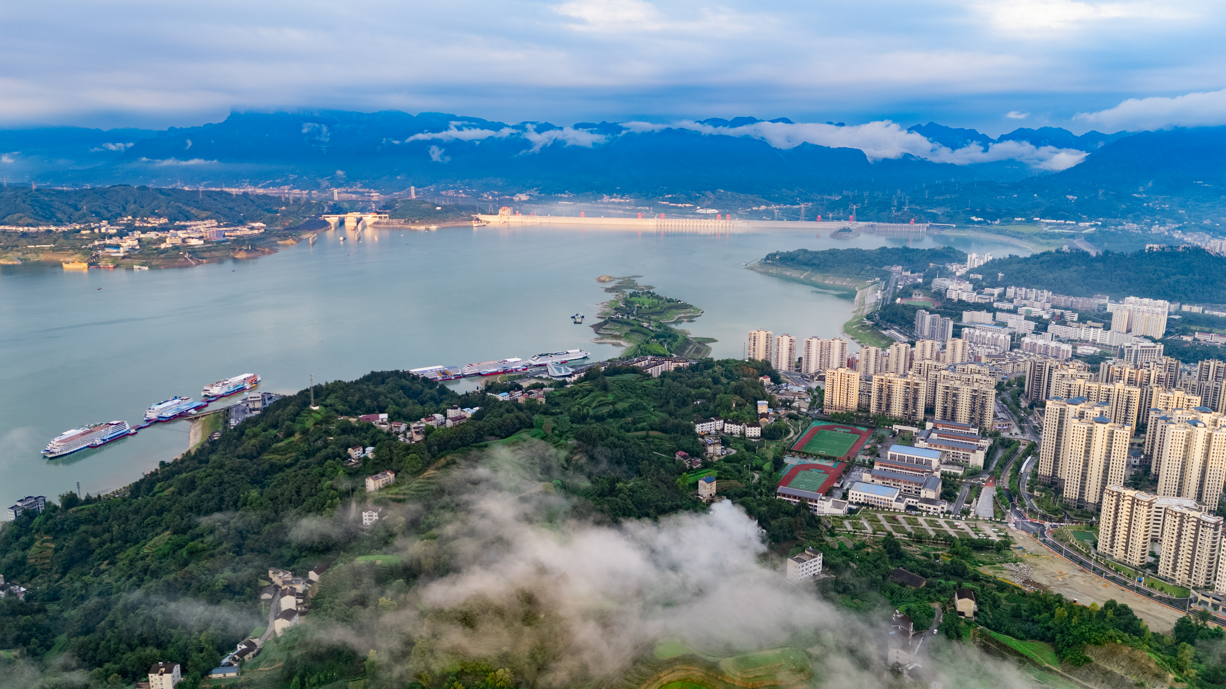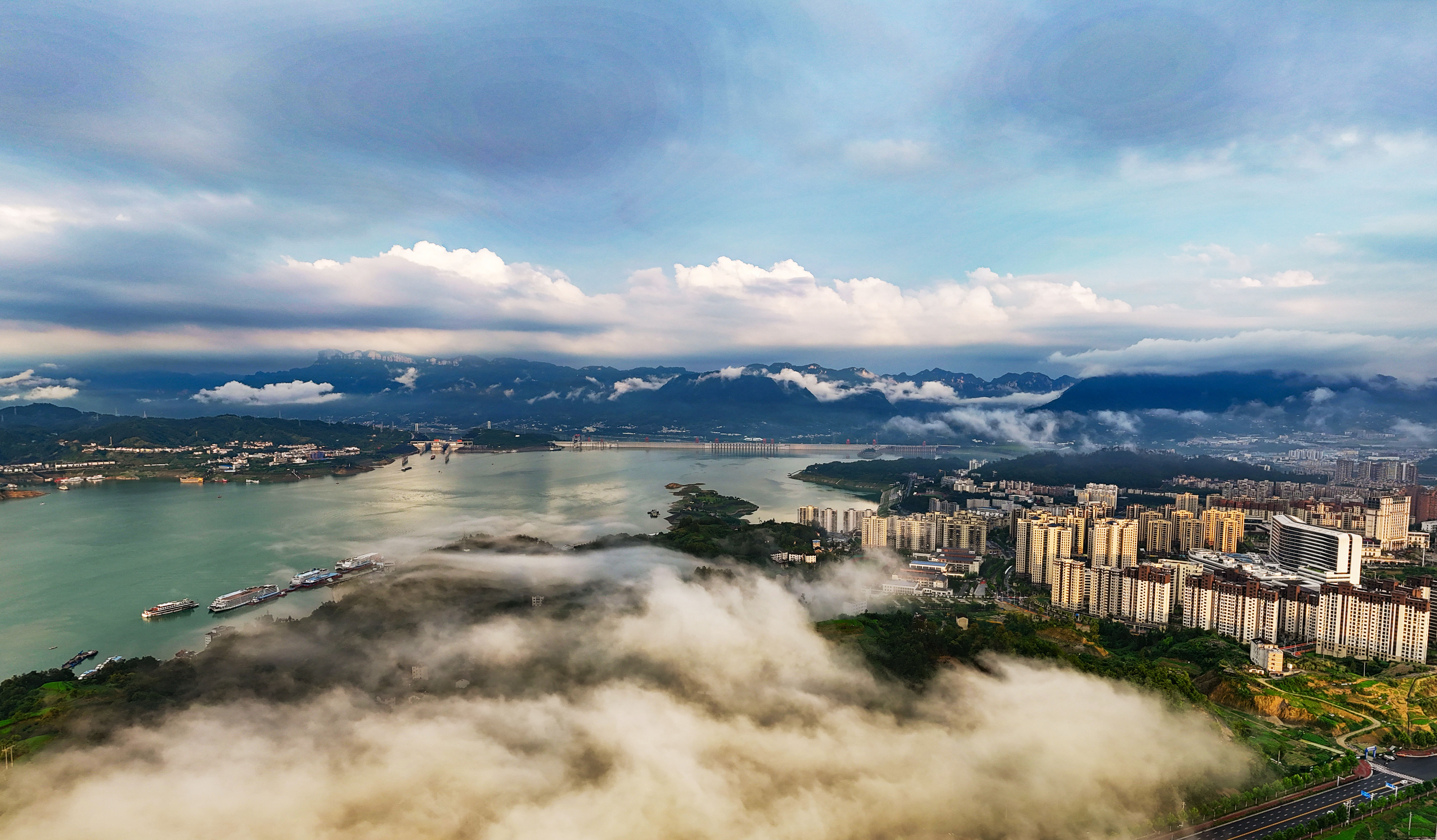 After a summer rain, mist drapes over Zigui County and the Three Gorges Dam. The iconic dam rises like a sentinel above the Yangtze River, its edges softened by fog. As water and sky blur into one, the whole scene takes on a dreamlike beauty.
