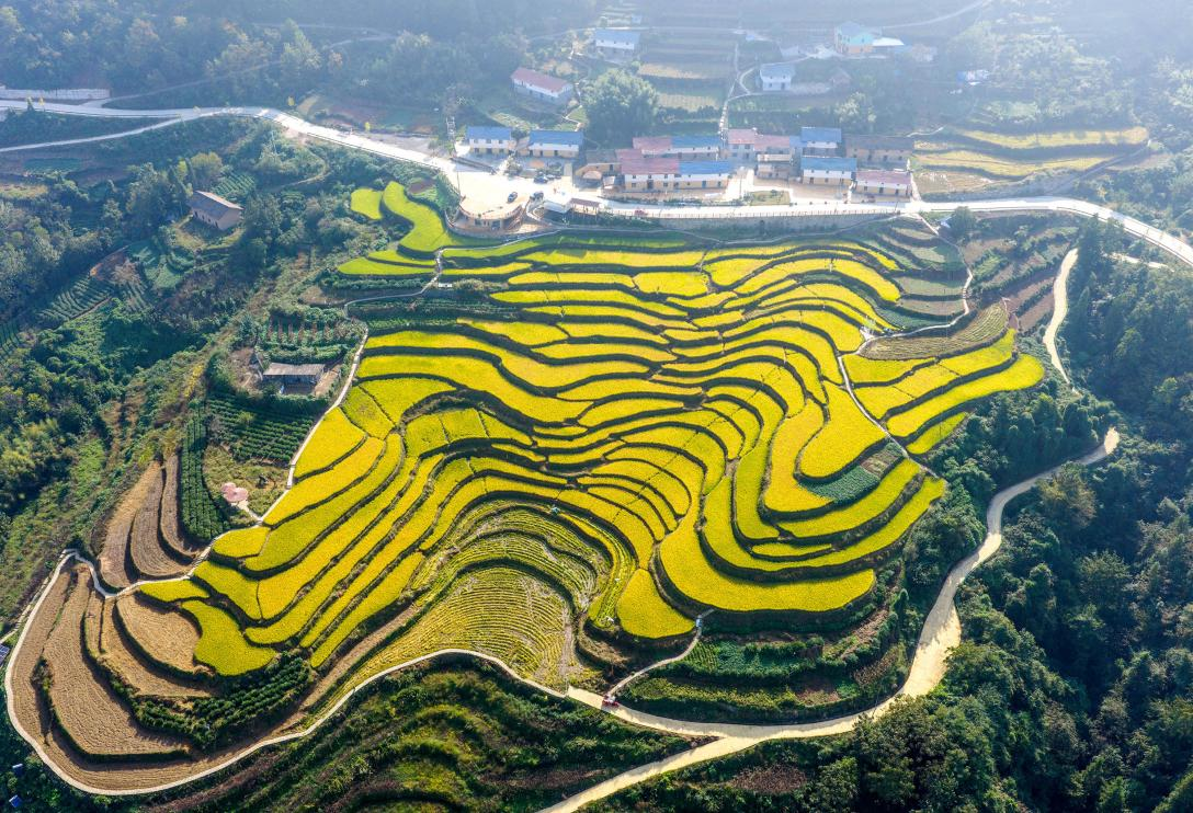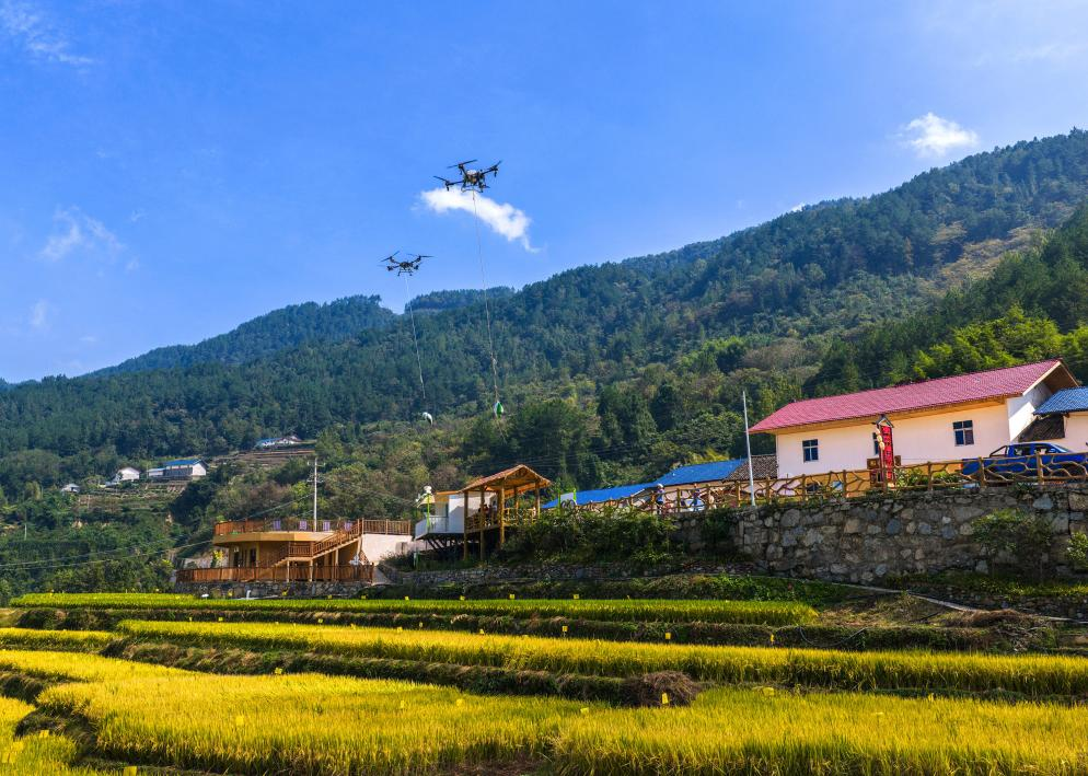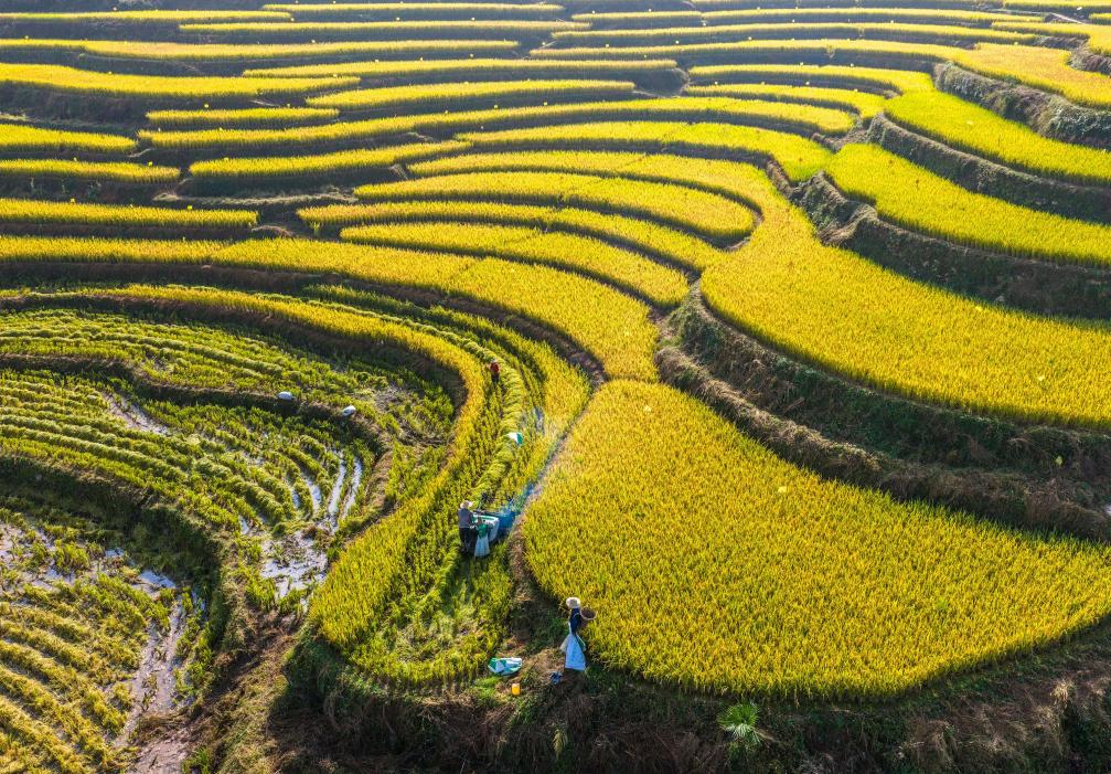 In Zigui, rice nourished by cold mountain springs has entered its harvest season. On the terraces, combine harvesters and drones operate side by side, enabling farmers to work efficiently.