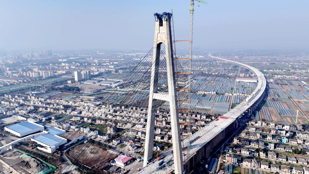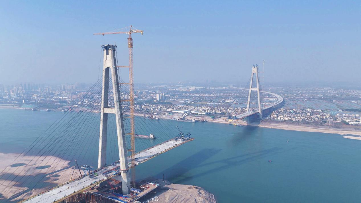 Construction is advancing steadily on the Zhijiang Yangtze River Bridge. The 1,549-meter project is now more than halfway complete, with crews working on both riverbanks to meet the scheduled closure in April 2026.