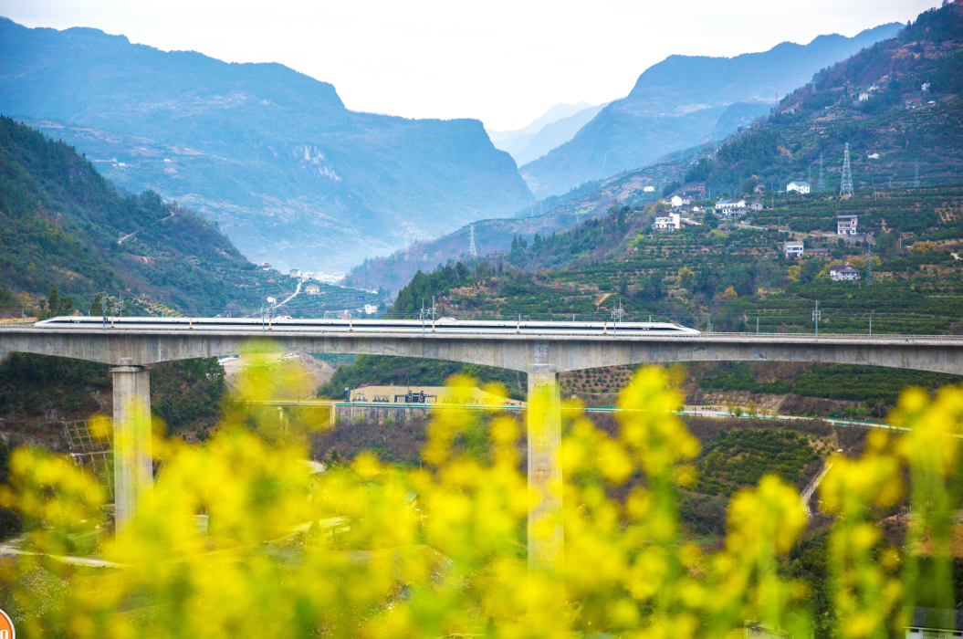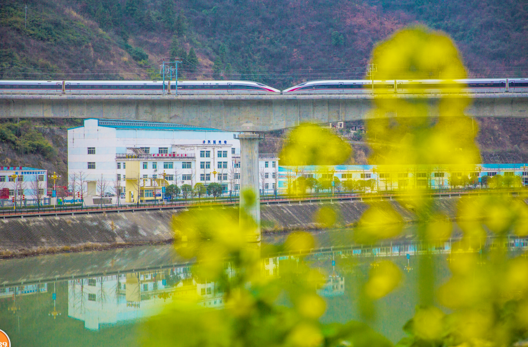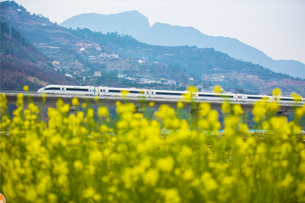 This is the first spring since the Zhengzhou-Wanzhou High-Speed rail line was opened. As the train speeds through Yichang’s Xingshan County, a spray of yellow canola flowers are in bloom along the route.
