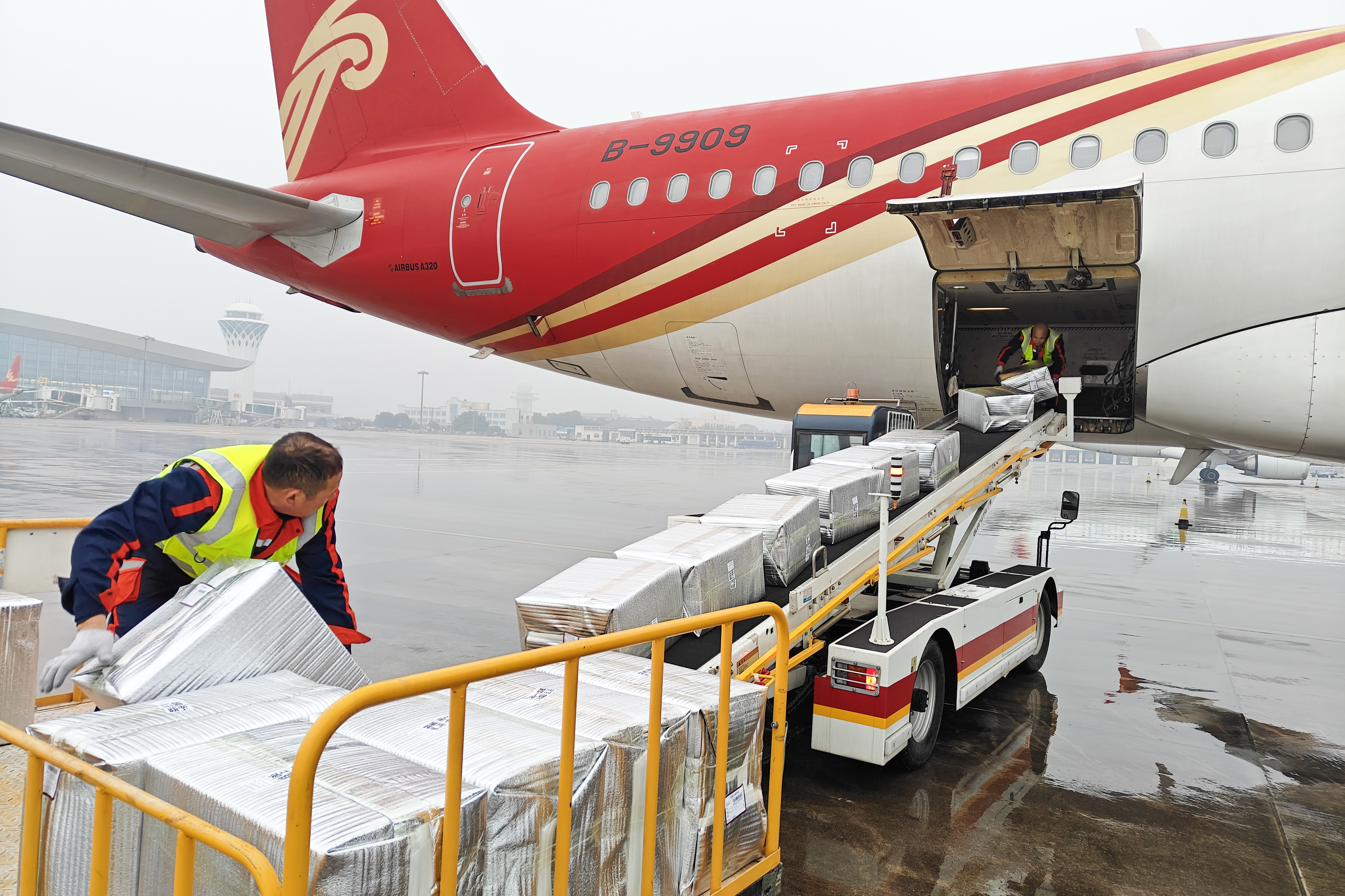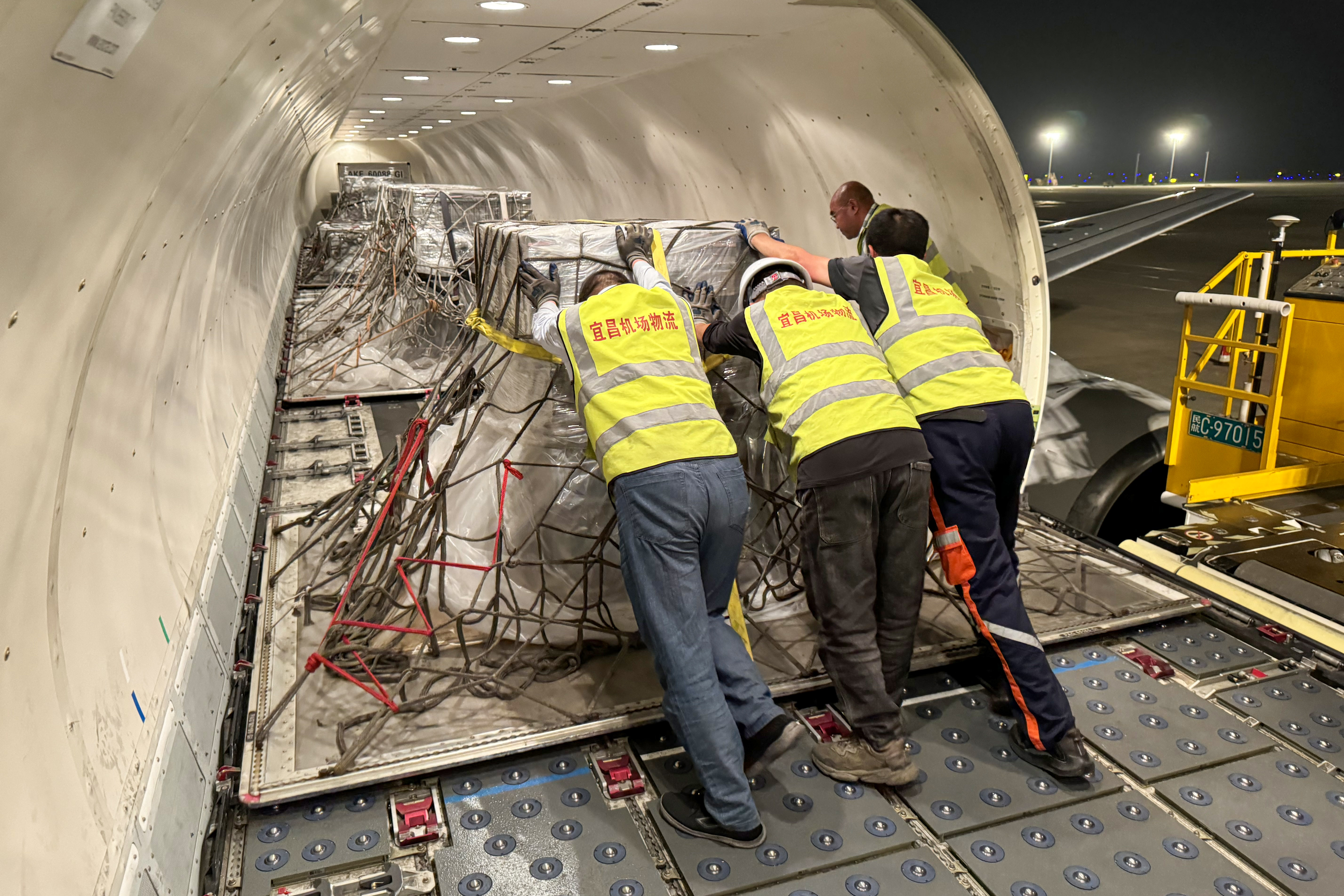 <caption> Logistics workers upload goods at Yichang Sanxia International Airport.