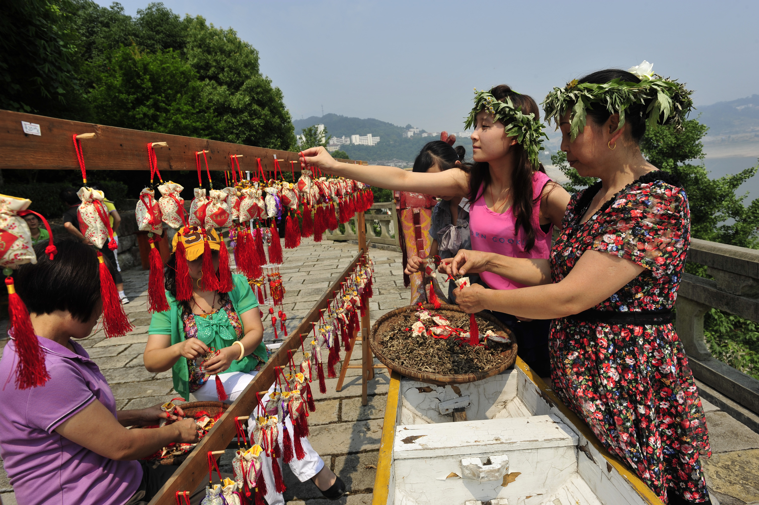 Parents often sew small bags using colorful silk cloths and threads, filling them with herbal medicine. They then hang the pouches around their children’s necks or tie them to their clothing to protect their children from evil and disease.