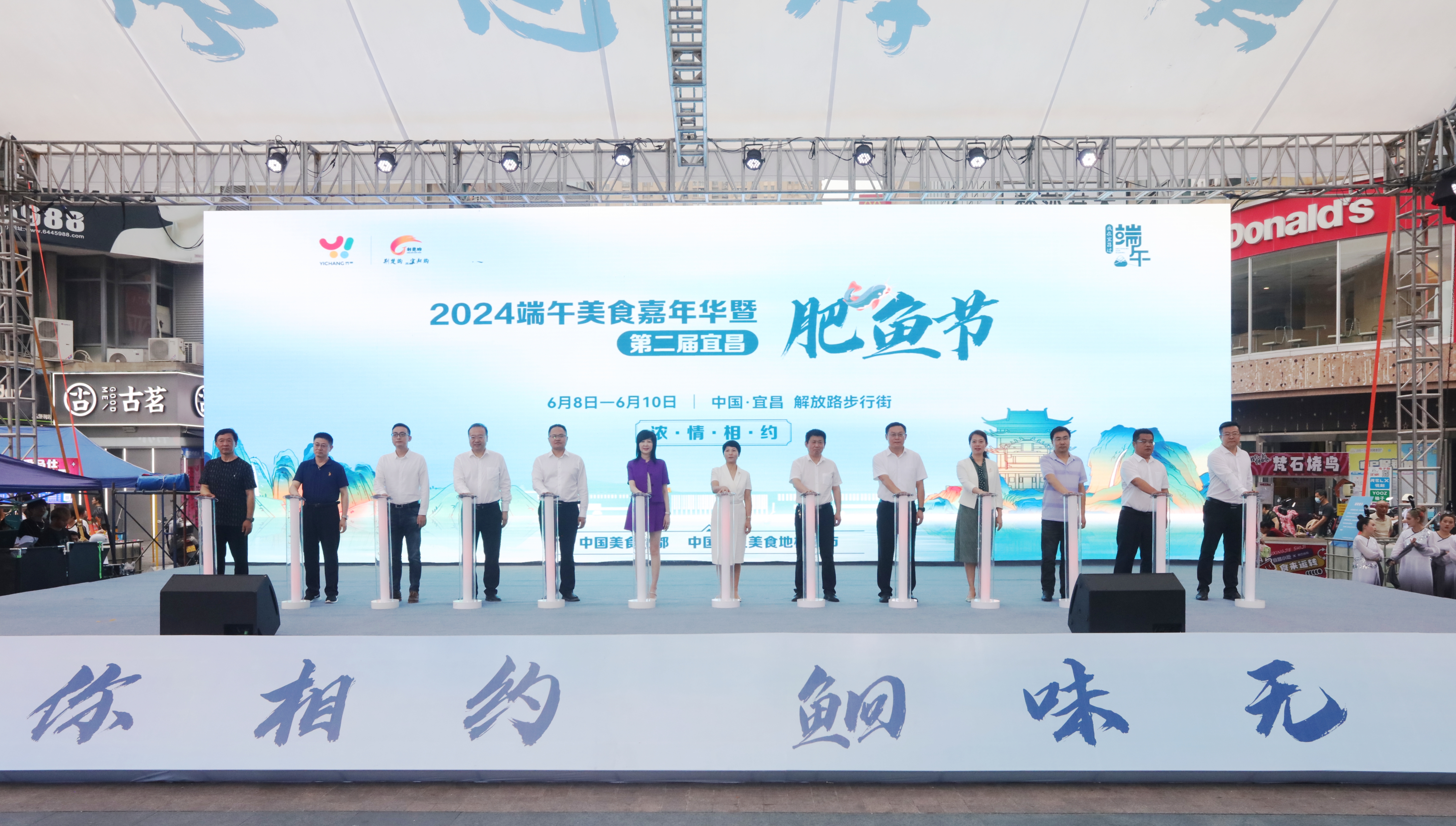 <caption>On June 8, an opening ceremony was held for the Dragon Boat Festival Food Carnival of Yichang-Jingzhou-Jingmen Metropolitan Circle and the Second Fatty Fish Festival. Representatives from Yichang, Jingzhou and Jingmen cities were present on stage to mark its launch.